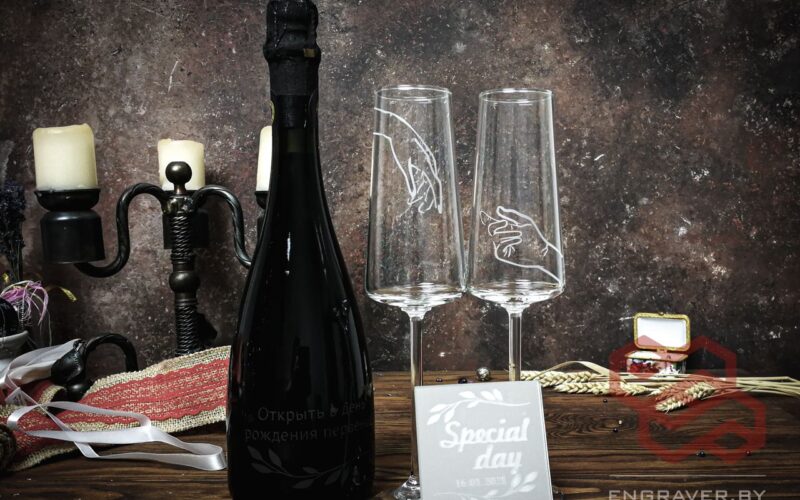 Эксклюзивный подарочный набор на свадьбу: бутылка шампанского, бокалы для шампанского и зеркальный магнит с гравировкой.